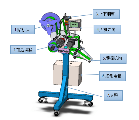 3)上下調(diào)整機(jī)構(gòu):調(diào)整貼標(biāo)頭上下,匹配流水線的高度。