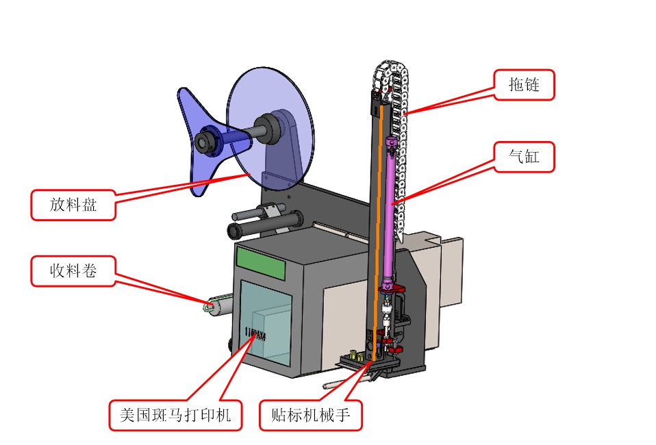 3.掃描槍掃描信息并傳回電腦,打印機打印標(biāo)簽,吸頭吸取標(biāo)簽;傳感器檢測到產(chǎn)品到達貼標(biāo)位,貼標(biāo)機械手進行貼標(biāo)